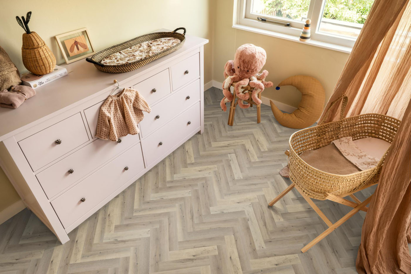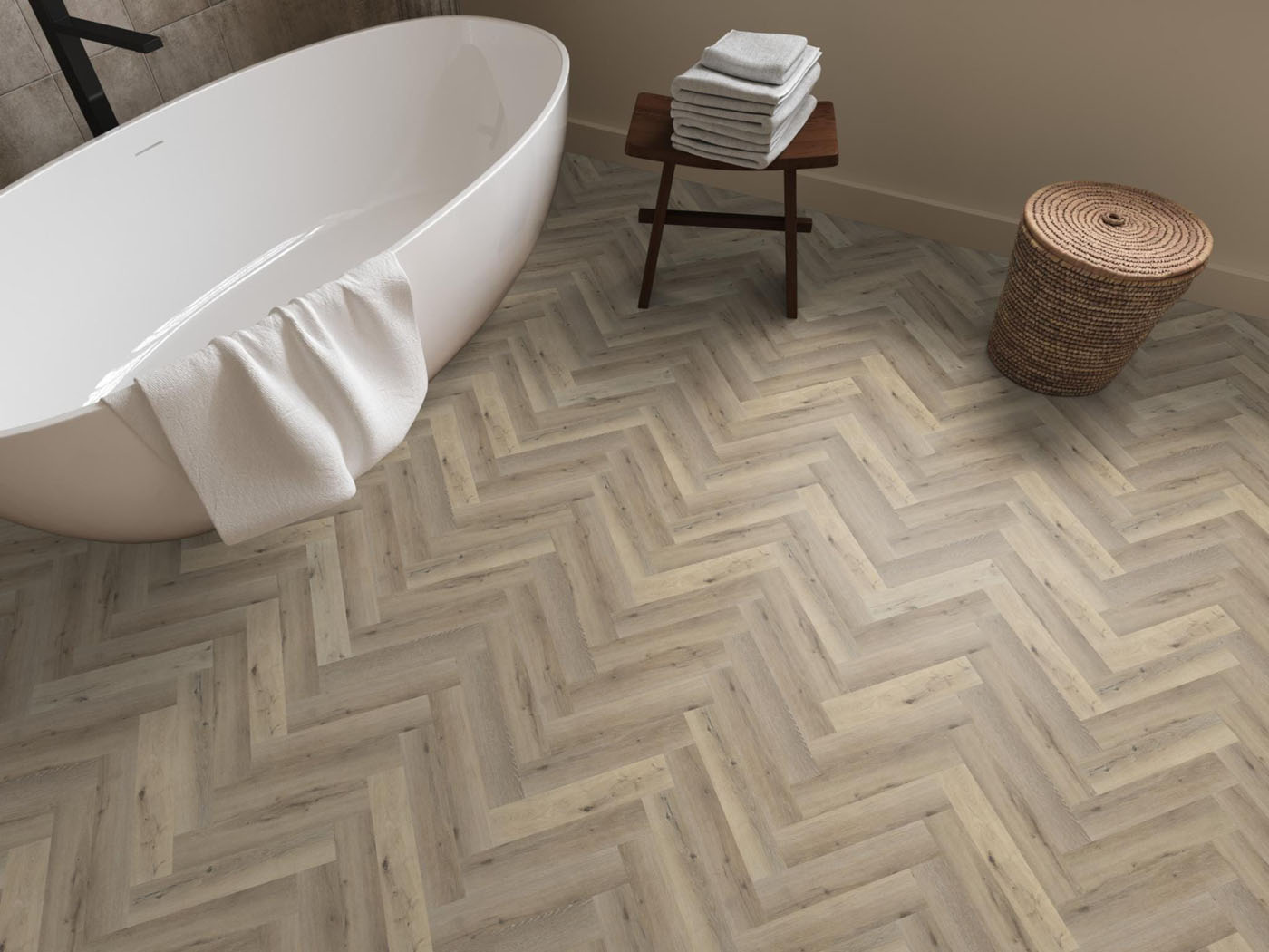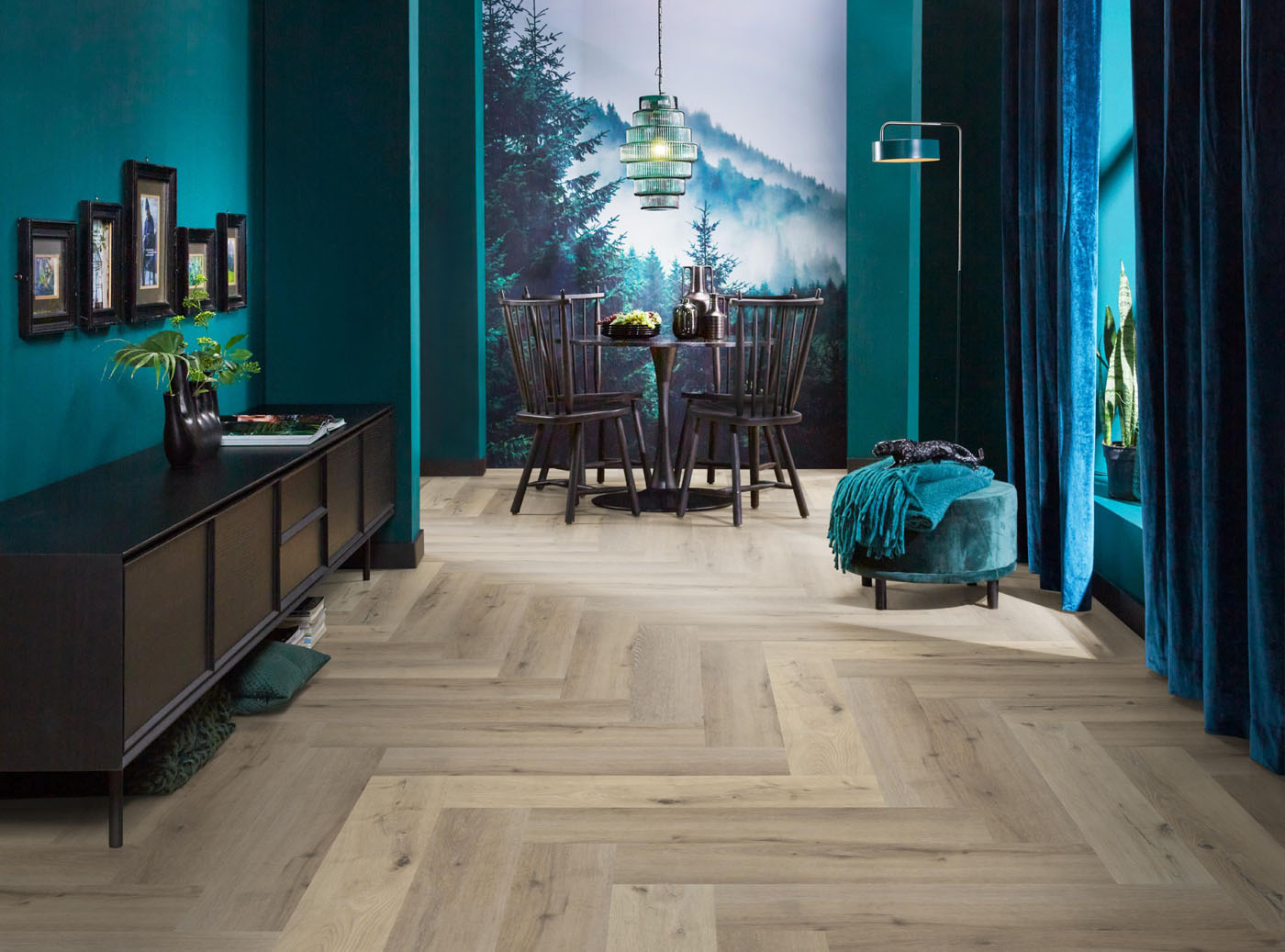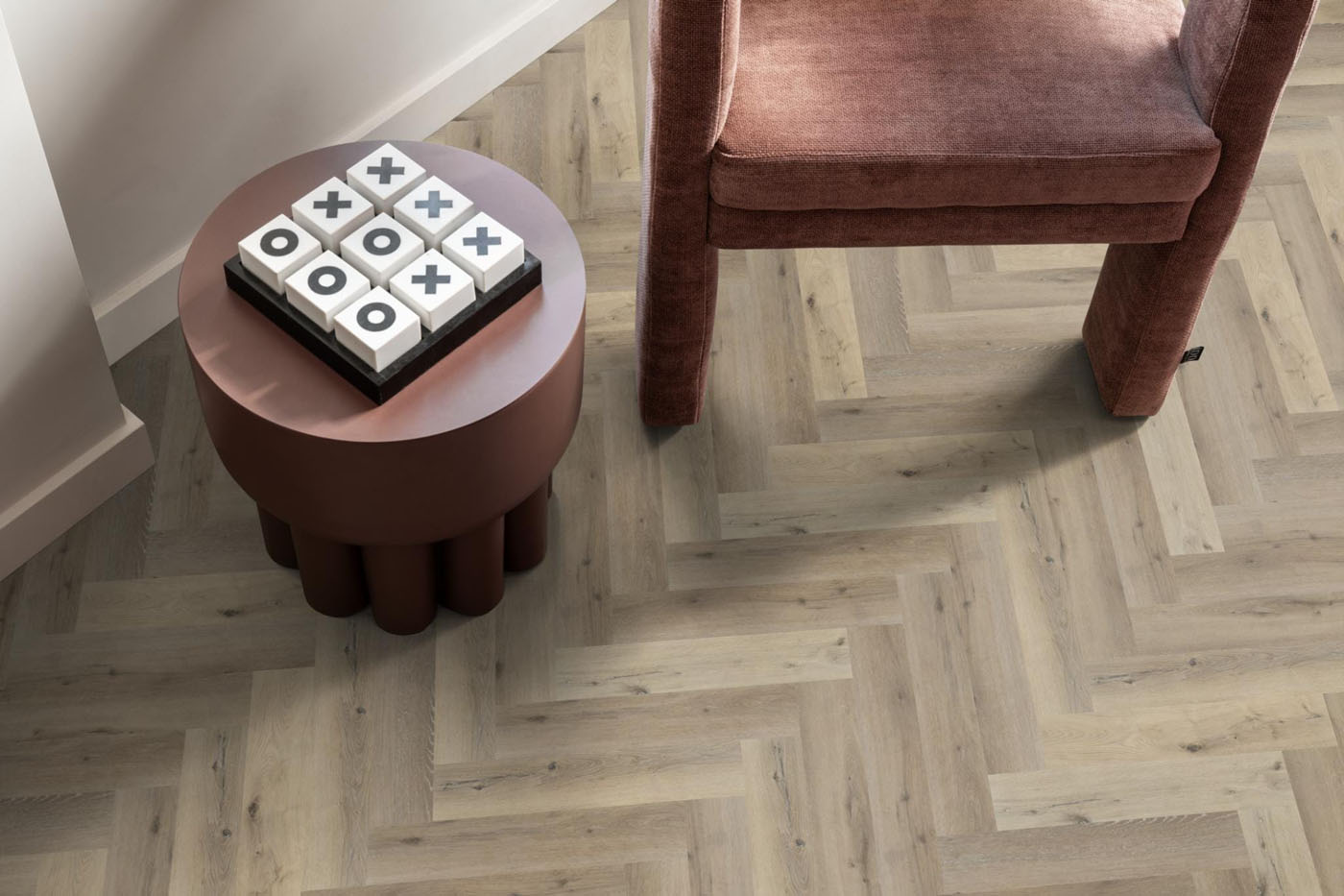 De Ambiant Spigato click pvc vloer combineert een moderne visgraatlook met extra geluidsdemping. Met 7 mm dikte en realistische houtstructuur ideaal voor elk interieur.