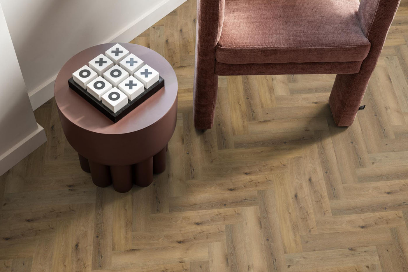 De Spigato Visgraat Dryback collectie van Ambiant brengt de klassieke charme van visgraat tot leven in een moderne uitvoering. Deze plak PVC-vloer is voorzien van een natuurgetrouwe houtstructuur (EIR), 4-zijdige micro V-groeven en een 0,55 mm slijtlaag – ideaal voor intensief gebruik in huis of project.