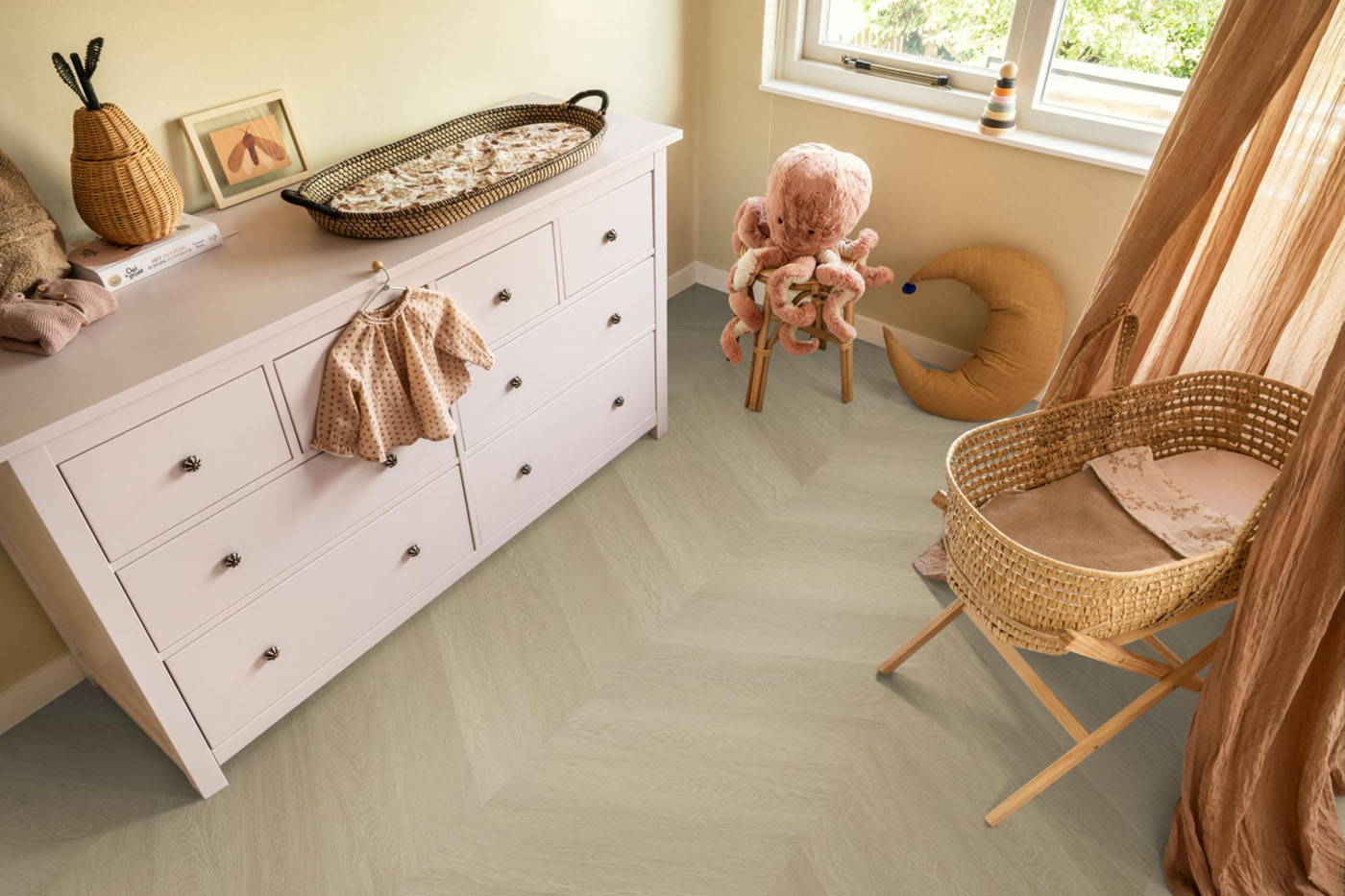 Gigafloor Spigato Estino Hongaarse punt dryback combineert een klassiek chevron‑patroon met de praktische voordelen van moderne PVC. Met een 0,55 mm slijtlaag, 2,5 mm dikte en R‑waarde 0,04 m²K/W is deze vloer klaar voor intensief woon- en projectgebruik en presteert hij uitstekend op vloerverwarming.