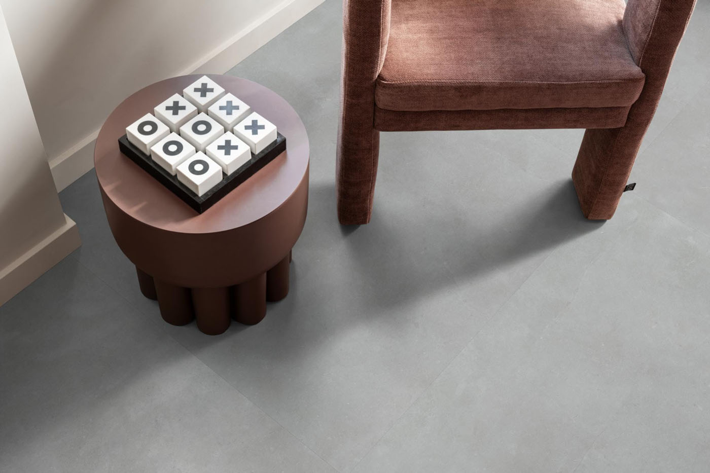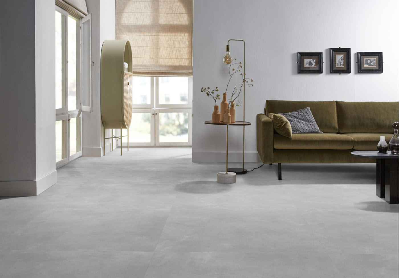 Gigafloor Piazzo XL plak PVC tegel: XL 91,4 × 91,4 cm betonlook, 0,55 mm slijtlaag.