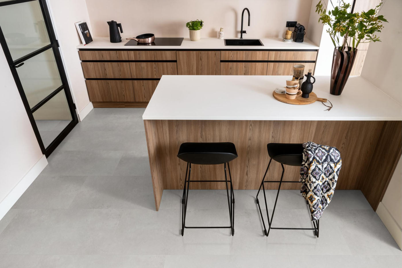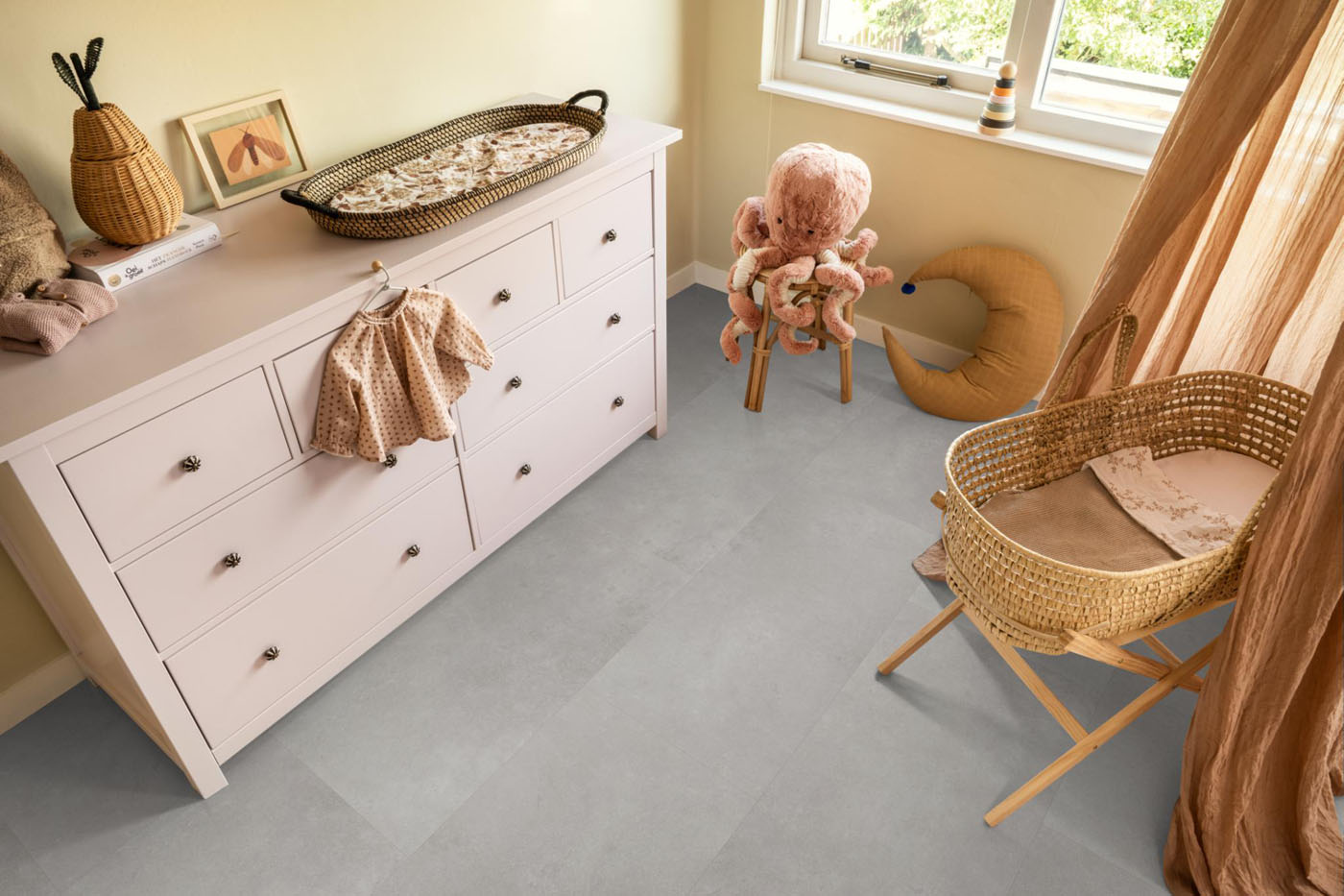 Gigafloor Sarino dryback is een rechthoekige PVC-tegel met een all‑over betonstructuur. Dankzij de 0,55 mm slijtlaag, 2,5 mm dikte en R‑waarde 0,04 m²K/W is Sarino geschikt voor intensief woon‑ en projectgebruik en presteert hij uitstekend op vloerverwarming.