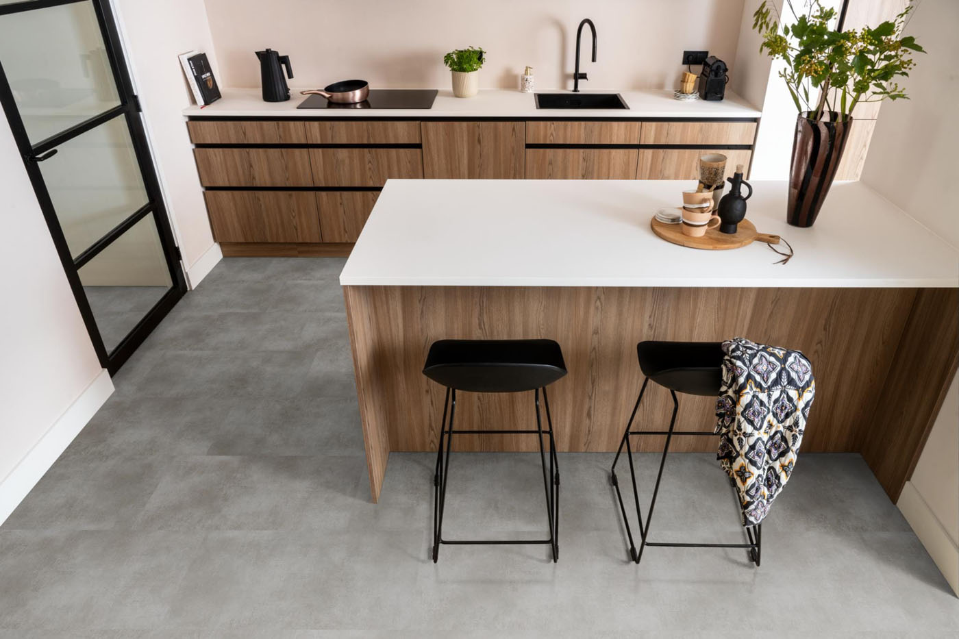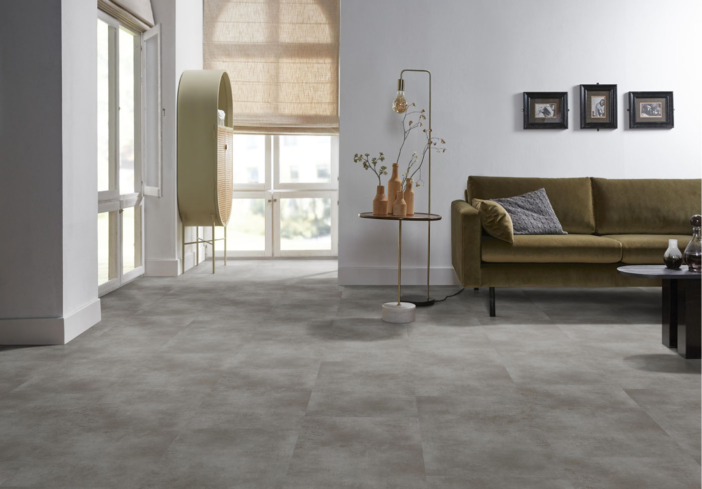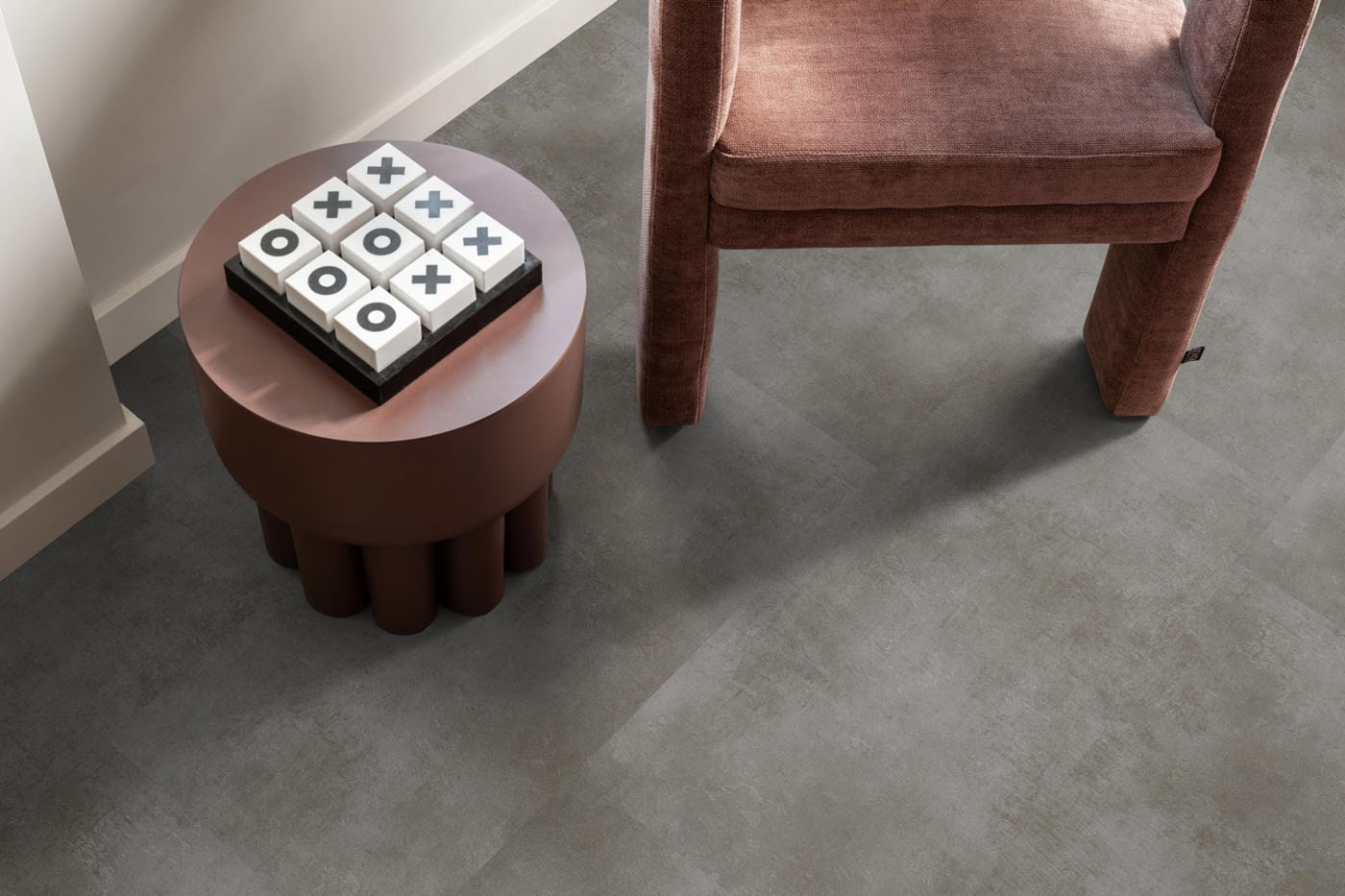 Gigafloor Concrete dryback is een stoere rechthoekige PVC-tegel met een robuuste betonlook. Een 0,55 mm slijtlaag, 2,5 mm dikte en R‑waarde 0,04 m²K/W maken deze vloer geschikt voor intensief woon‑ en projectgebruik en voor vloerverwarming.
