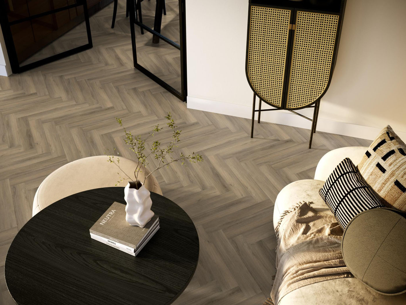 De YUP Herringbone Dryback collectie van Gigafloor combineert een verfijnde visgraatlook met moderne duurzaamheid. Met stroken van 59,5 × 11,9 cm, matte EIR-structuur en een sterke 0,55 mm toplaag voldoet deze vloer aan de hoogste eisen qua design, onderhoudsgemak en slijtvastheid.