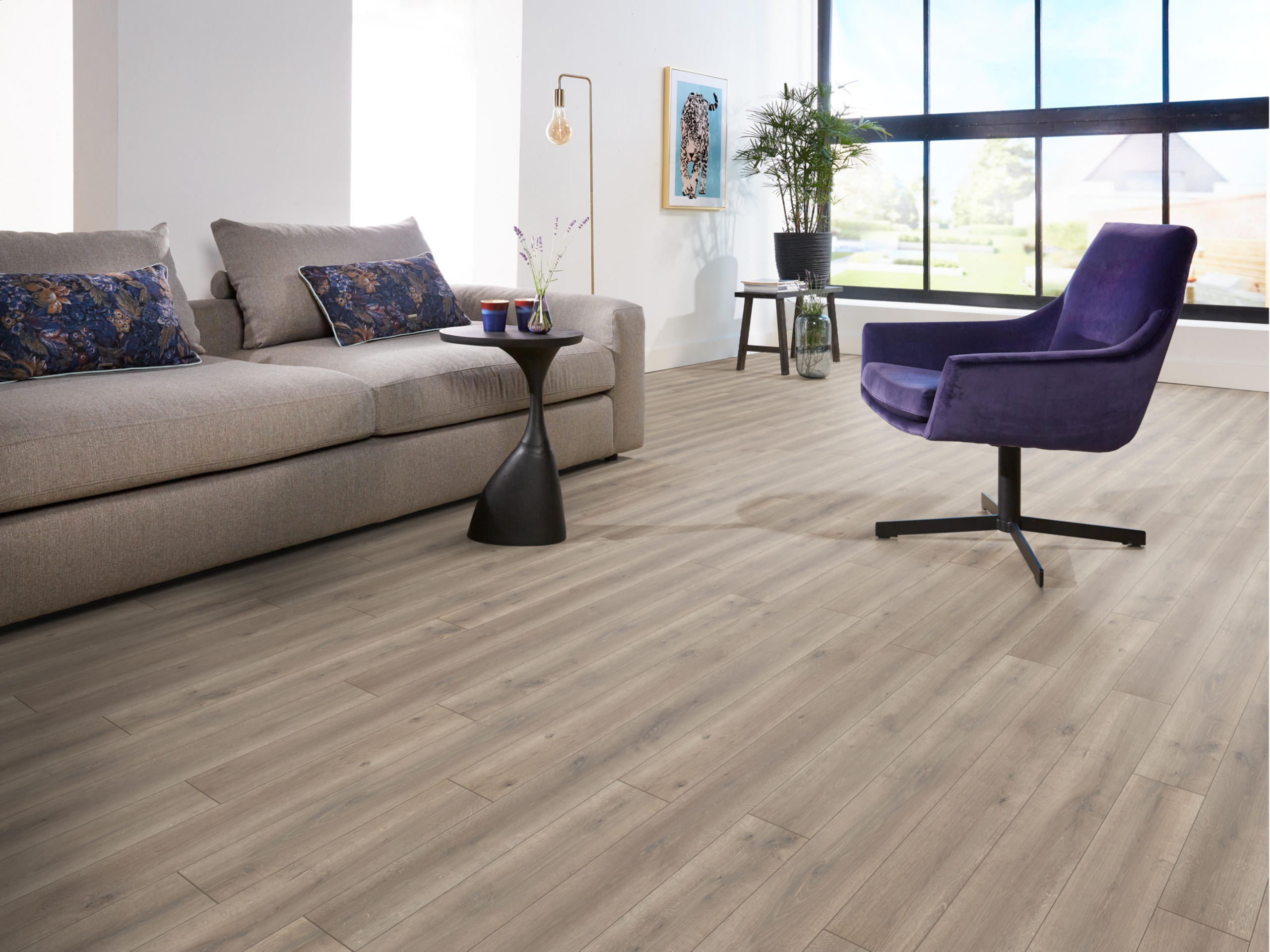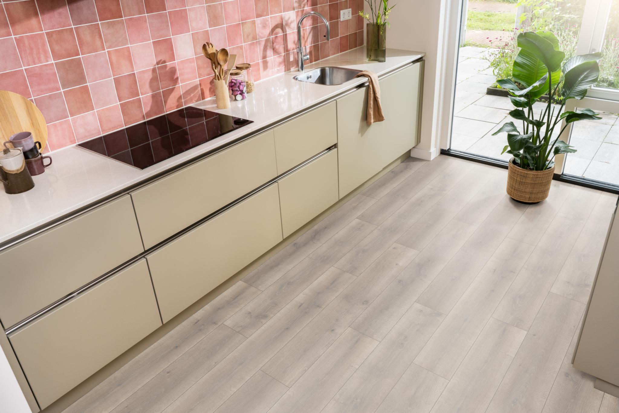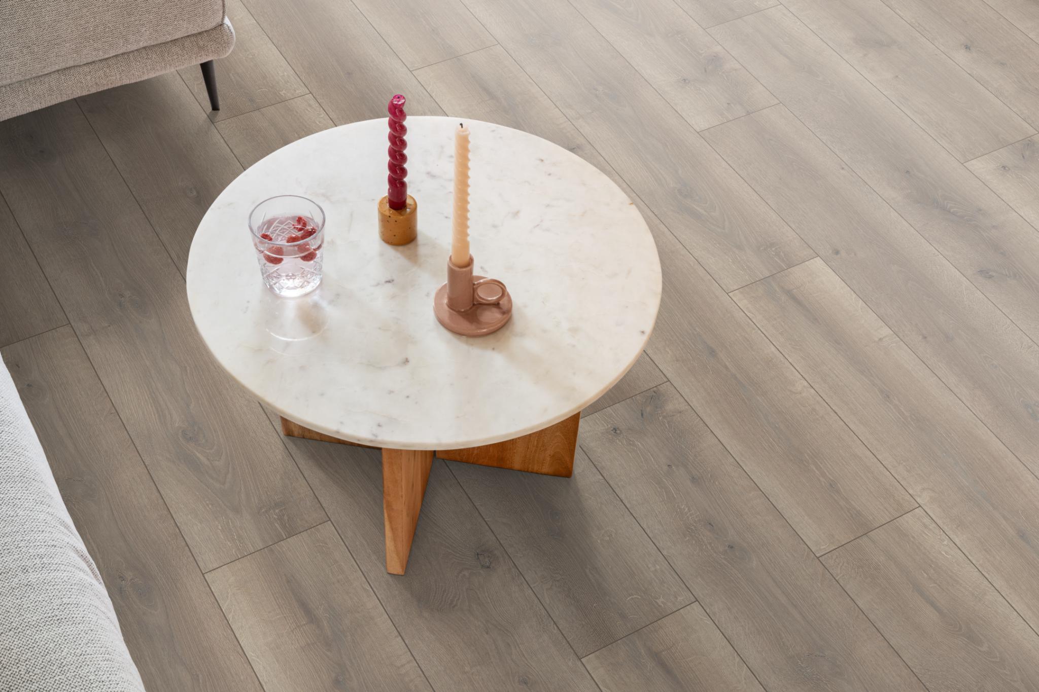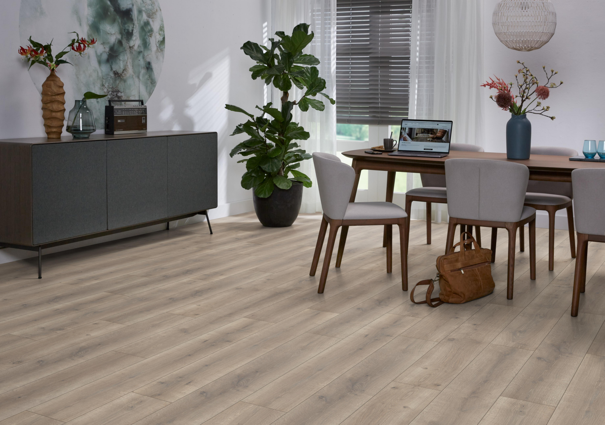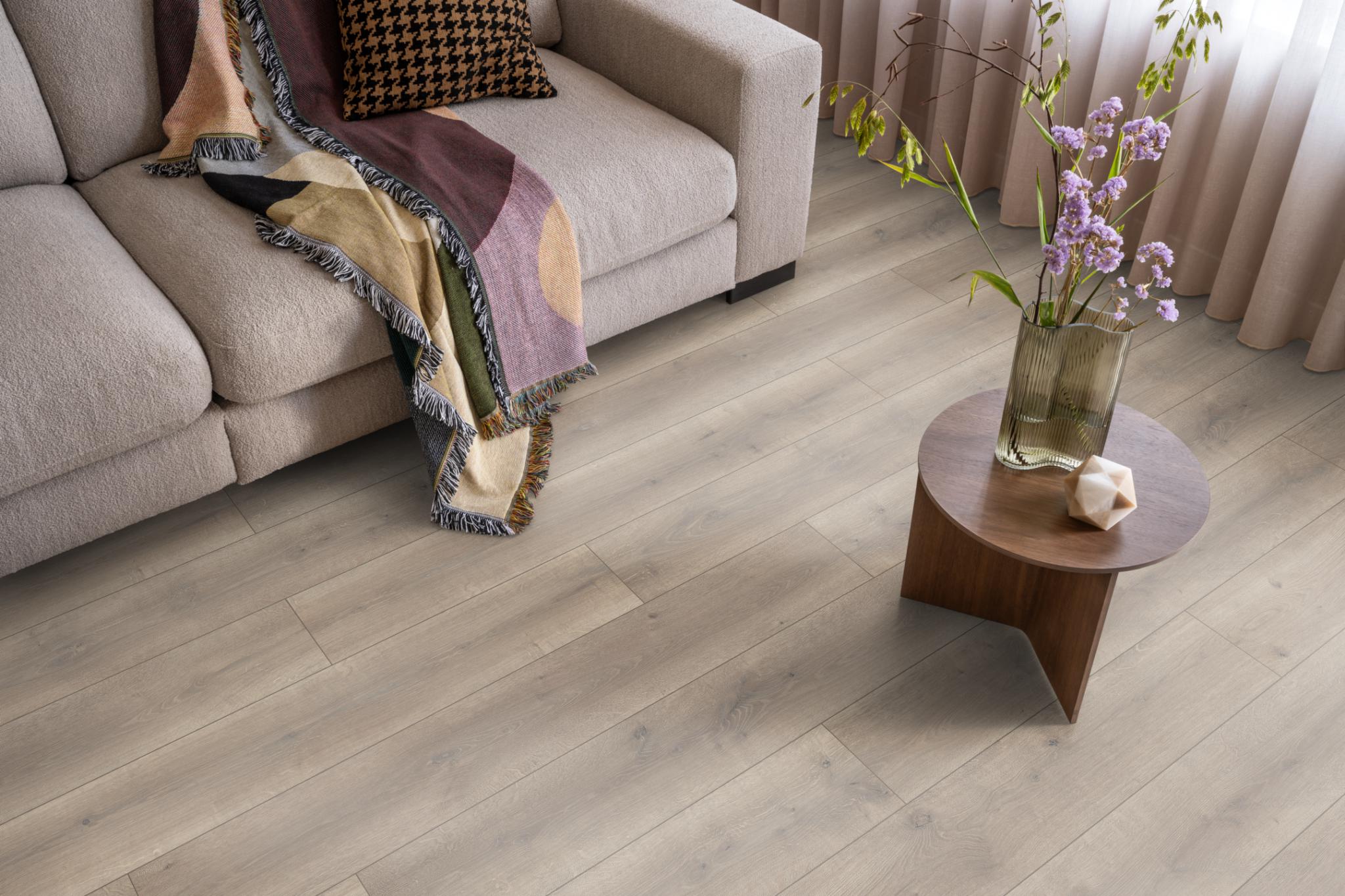 Ambiant Elite laminaat combineert brede planken (1286 × 194 mm) met een matte EIR-structuur. Verkrijgbaar in 6 eigentijdse eikendecors. Vraag direct een offerte aan bij Giga Vloeren – Groot in vloeren, klein in prijs.