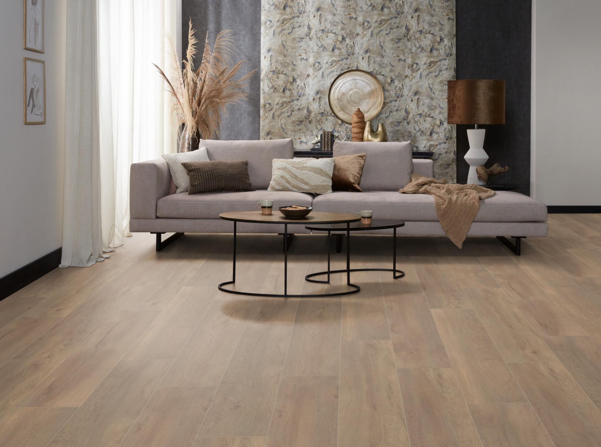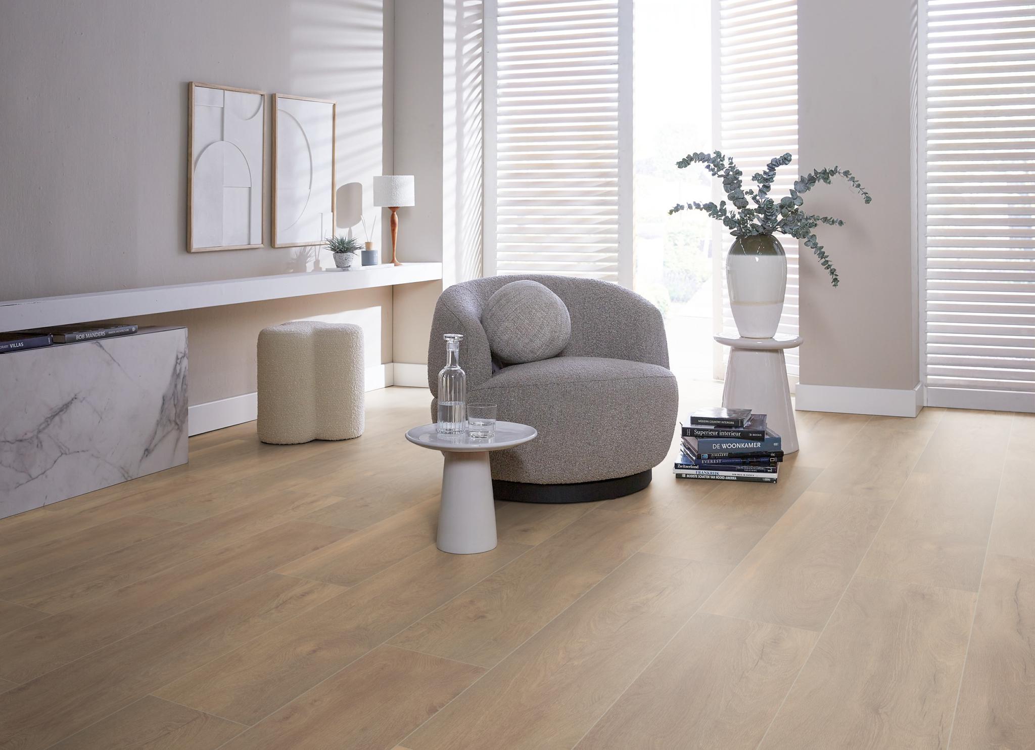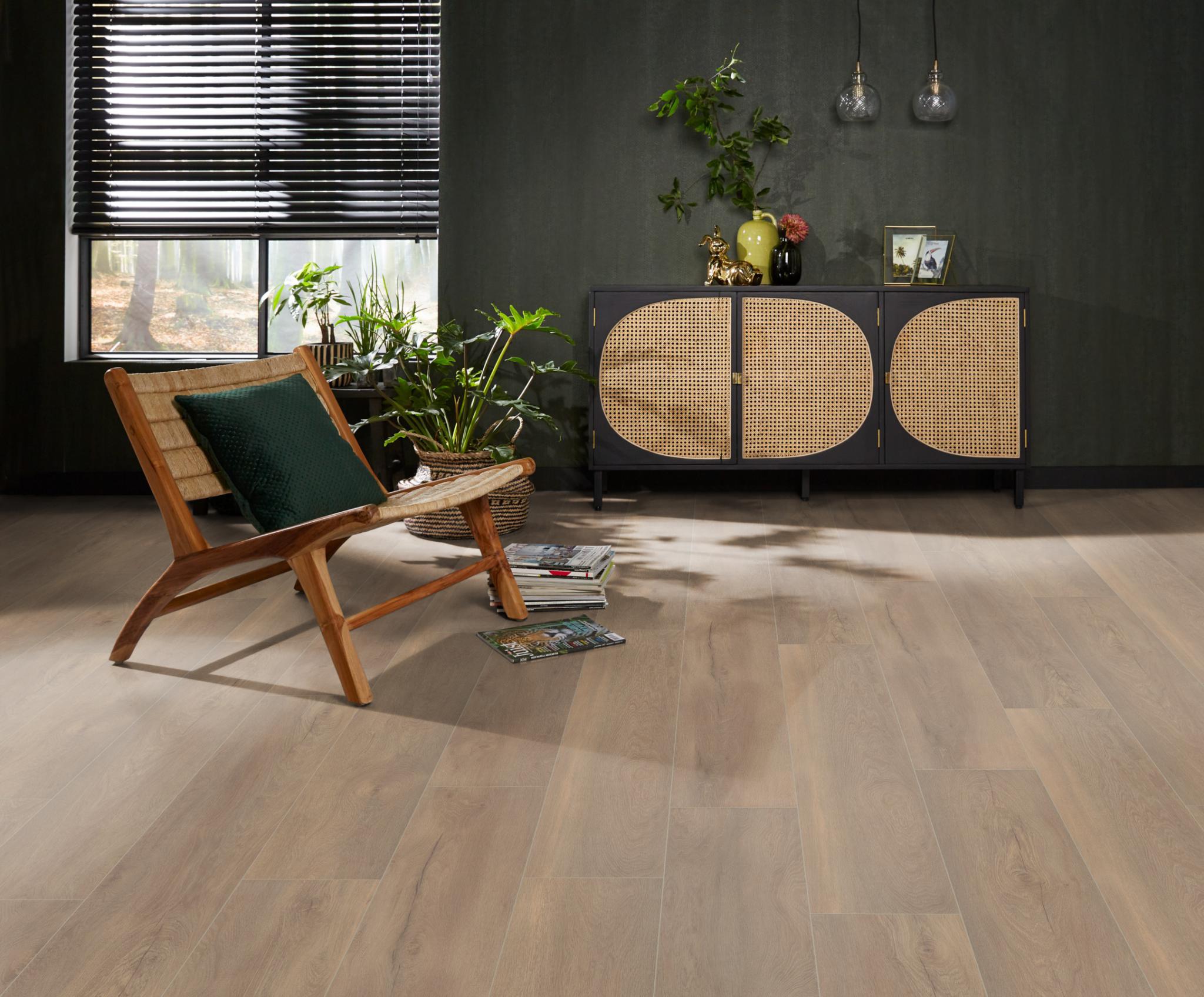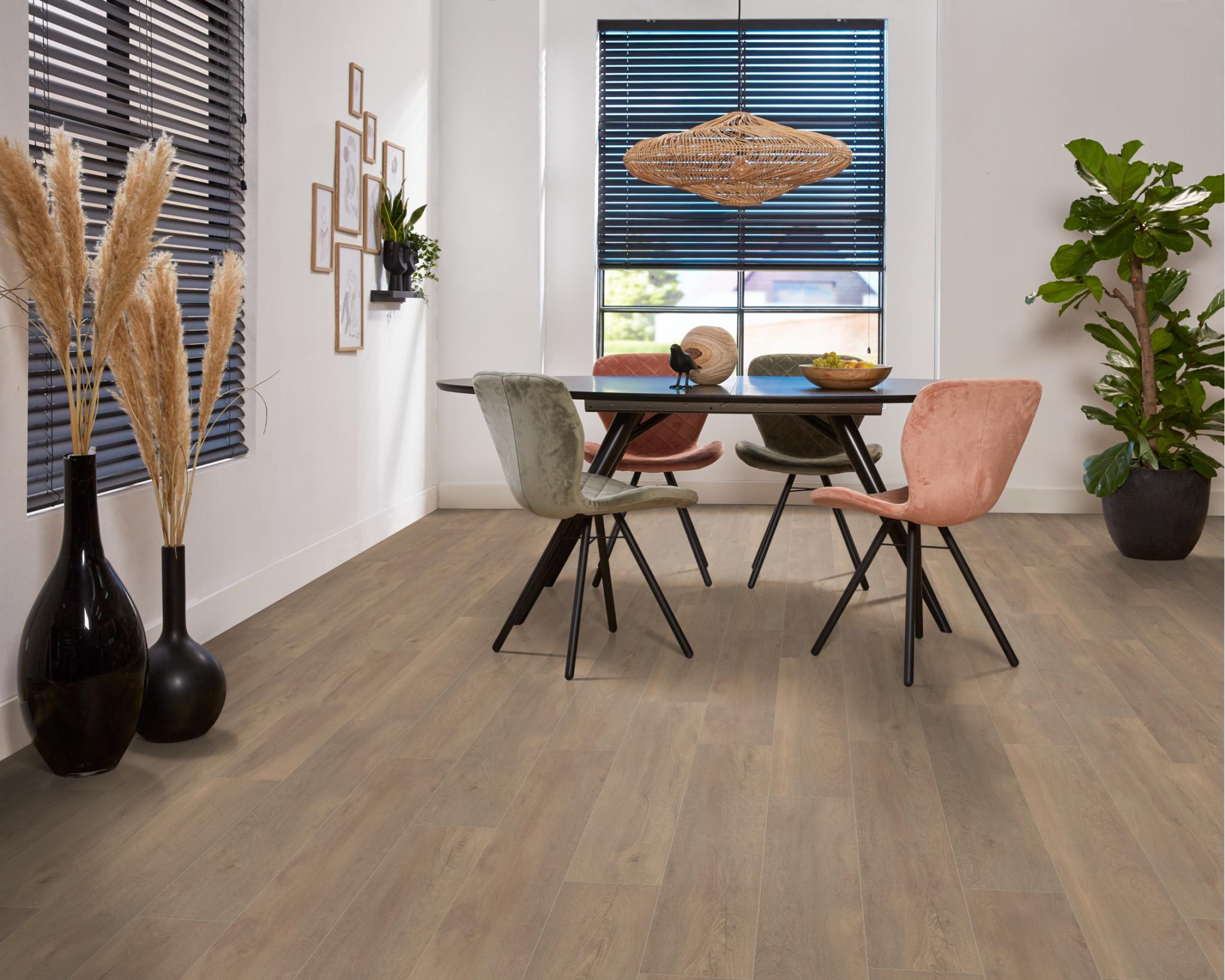 Sfeervolle laminaatvloer uit de Ambiant Saarland collectie – geschikt voor vloerverwarming, waterbestendig en natuurgetrouw afgewerkt.