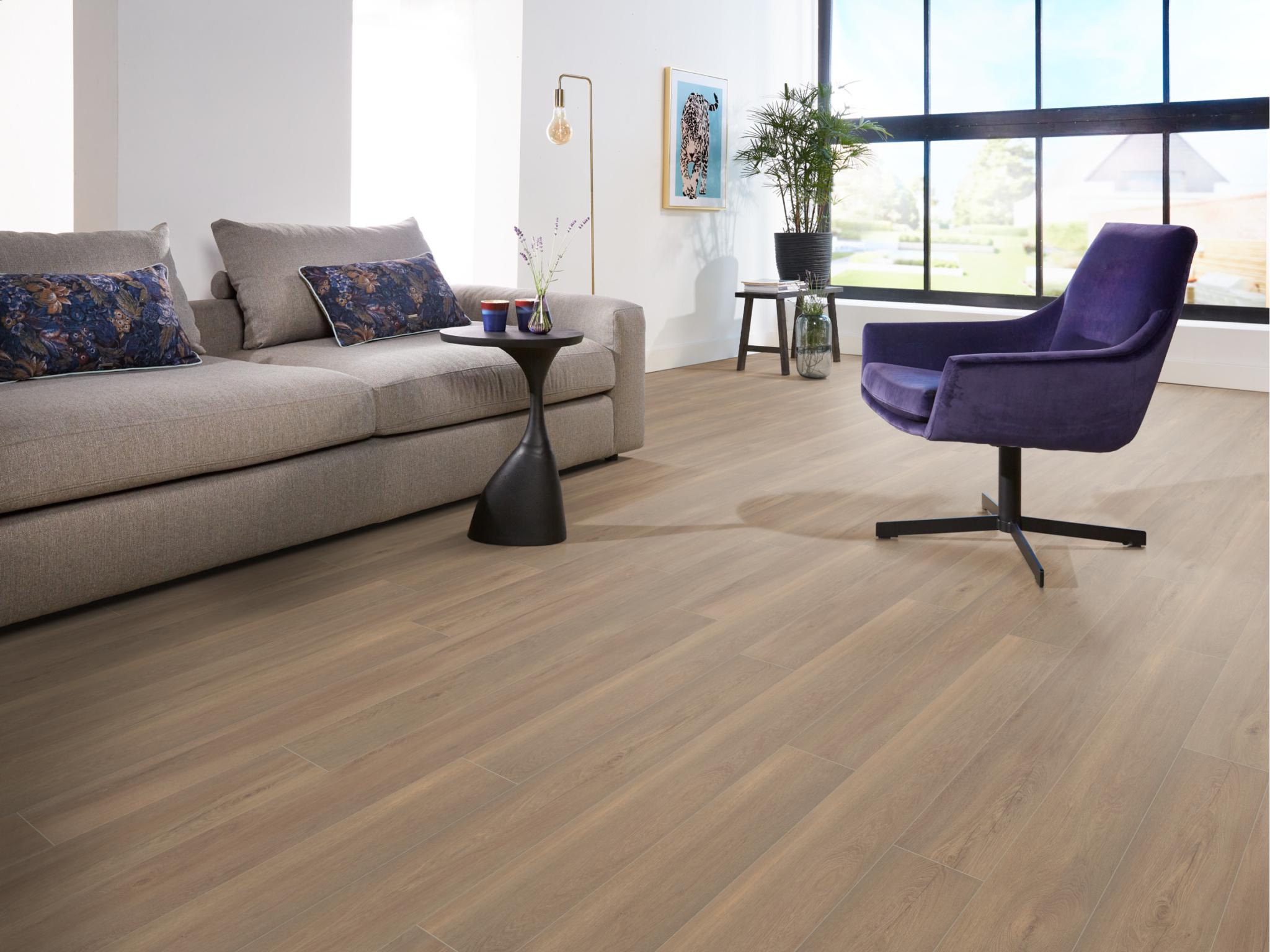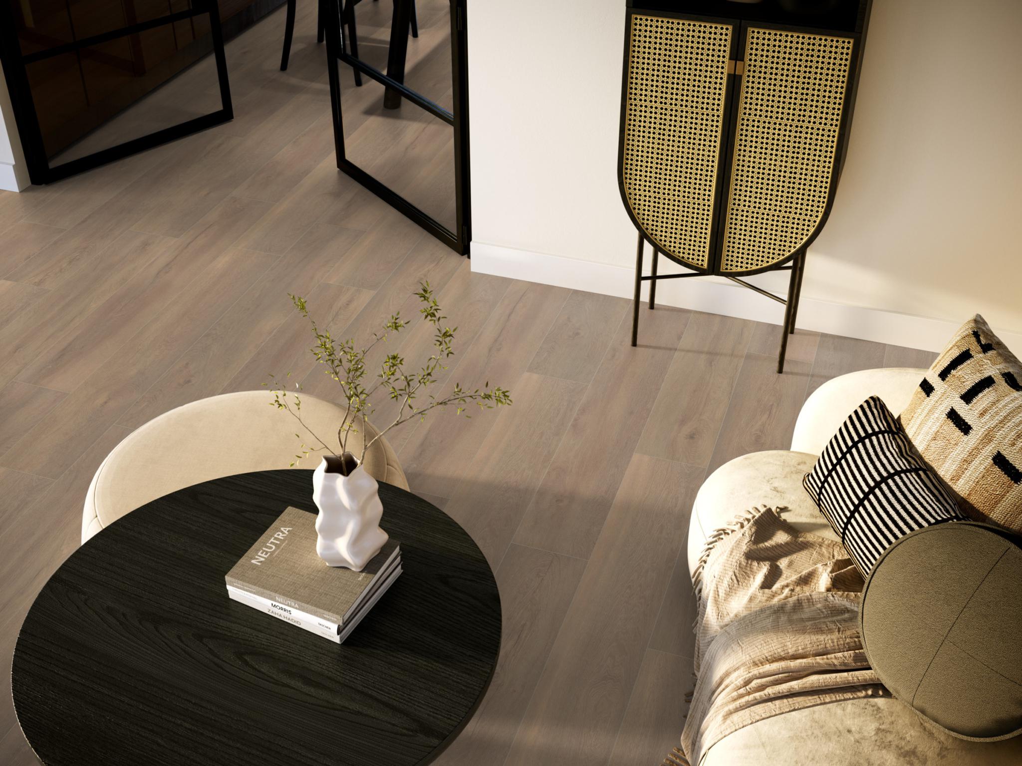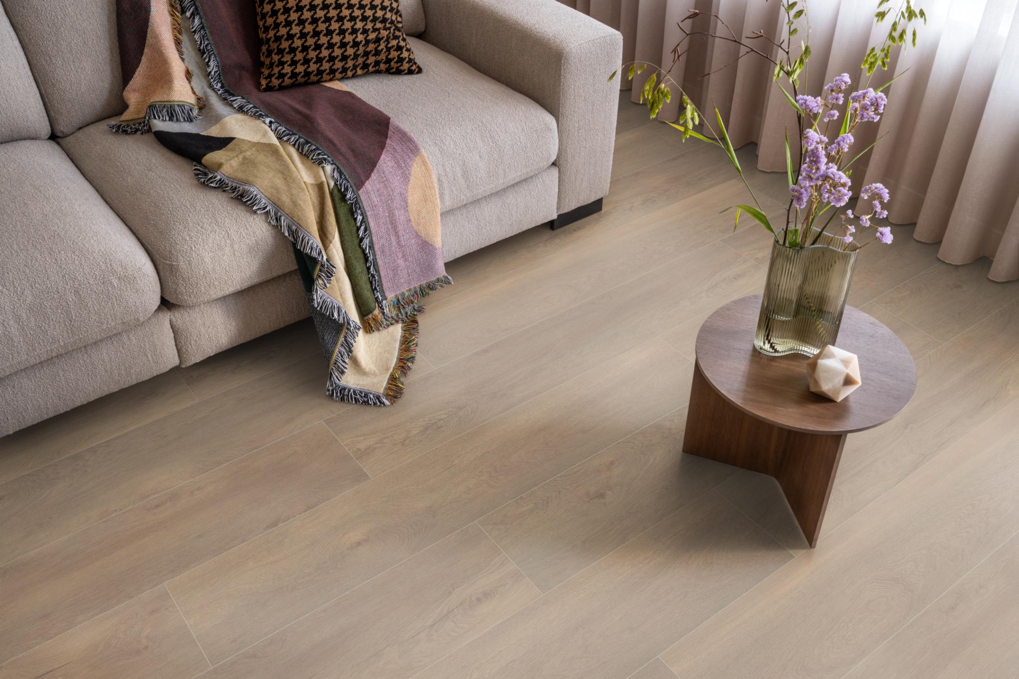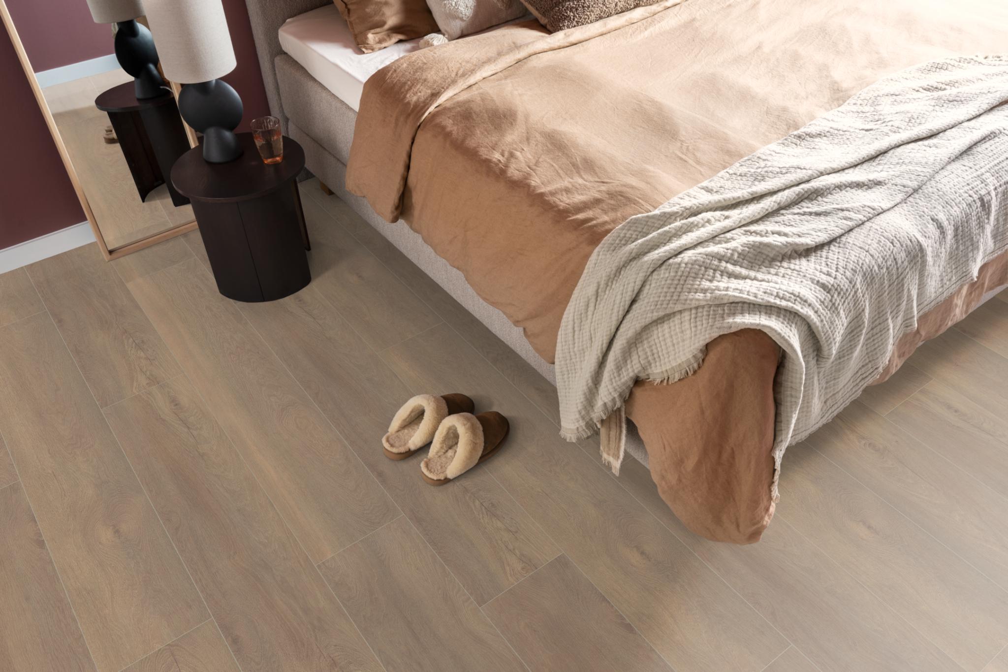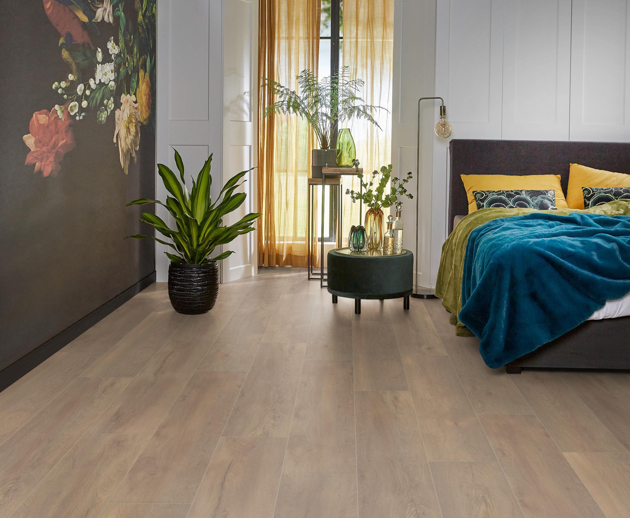Sfeervolle laminaatvloer uit de Ambiant Saarland collectie – geschikt voor vloerverwarming, waterbestendig en natuurgetrouw afgewerkt.