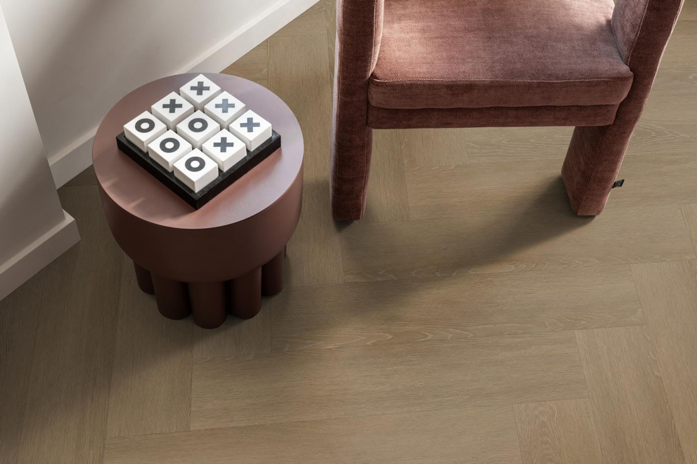 De Ambiant Herringbone visgraat klik PVC-vloer met 10dB geïntegreerde ondervloer is stijlvol, stil en geschikt voor intensief gebruik. Eenvoudige installatie dankzij het kliksysteem en geschikt voor vloerverwarming.